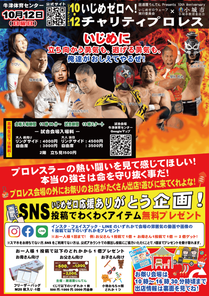 いじめゼロウェーブとして初めてのチャリティ企画として10月12日にお祭り会場とチャリティプロレスイベントを行います。
