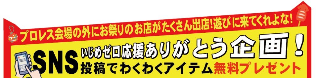 当日は試合だけでなく、屋外ではお祭りのように多くの出店や体験ブースも楽しめます。また、SNS投稿で参加者限定のプレゼント企画も実施。ご家族や友人と一緒に、プロレスの迫力と地域のにぎわいを存分に味わえるイベントです。