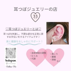 チラシに掲載してあるお店以外のお店も多数出店していますので、ぜひ会場まで遊びに来てください!耳つぼジュエリー「33mi mi」